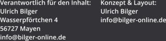 EinleitungBei der Website www.bilger-online.de handelt es sich um eine private Website. Über die Bewertung und/oder Verlinkung auf externe Websiten erfolgt keine Vergütung oder anderweitige Vorteilnahme.Alle beschriebenen Orte wurden durch mich persönlich besucht.Haftung für InhalteAlle Inhalte meines Internetauftritts wurden mit größter Sorgfalt und nach bestem Gewissen erstellt. Für die Richtigkeit, Vollständigkeit und Aktualität der Inhalte können ich jedoch keine Gewähr übernehmen. Als Diensteanbieter bin ich gemäß § 7 Abs.1 TMG für eigene Inhalte auf diesen Seiten nach den allgemeinen Gesetzen verantwortlich. Nach §§ 8 bis 10 TMG bin ich als Diensteanbieter jedoch nicht verpflichtet, übermittelte oder gespeicherte fremde Informationen zu überwachen oder nach Umständen zu forschen, die auf eine rechtswidrige Tätigkeit hinweisen. Verpflichtungen zur Entfernung oder Sperrung der Nutzung von Informationen nach den allgemeinen Gesetzen bleiben hiervon unberührt.Eine diesbezügliche Haftung ist jedoch erst ab dem Zeitpunkt der Kenntniserlangung einer konkreten Rechtsverletzung möglich. Bei Bekanntwerden von den o.g. Rechtsverletzungen werden ich diese Inhalte unverzüglich entfernen.Haftungsbeschränkung für externe LinksMeine Webseite enthält Links auf externe Webseiten Dritter. Auf die Inhalte dieser direkt oder indirekt verlinkten Webseiten haben ich keinen Einfluss. Daher kann ich für die „externen Links“ auch keine Gewähr auf Richtigkeit der Inhalte übernehmen. Für die Inhalte der externen Links sind die jeweilige Anbieter oder Betreiber (Urheber) der Seiten verantwortlich.Die externen Links wurden zum Zeitpunkt der Linksetzung auf eventuelle Rechtsverstöße überprüft und waren im Zeitpunkt der Linksetzung frei von rechtswidrigen Inhalten. Eine ständige inhaltliche Überprüfung der externen Links ist ohne konkrete Anhaltspunkte einer Rechtsverletzung nicht möglich. Bei direkten oder indirekten Verlinkungen auf die Webseiten Dritter, die außerhalb meines Verantwortungsbereichs liegen, würde eine Haftungsverpflichtung ausschließlich in dem Fall nur bestehen, wenn ich von den Inhalten Kenntnis erlangen und es mir technisch möglich und zumutbar wäre, die Nutzung im Falle rechtswidriger Inhalte zu verhindern.Diese Haftungsausschlusserklärung gilt auch innerhalb des eigenen Internetauftrittes [www.bilger-online.de] gesetzten Links und Verweise von eventuellen Fragestellern, Blogeinträgern, Gästen eines evtl. Diskussionsforums. Für illegale, fehlerhafte oder unvollständige Inhalte und insbesondere für Schäden, die aus der Nutzung oder Nichtnutzung solcherart dargestellten Informationen entstehen, haftet allein der Diensteanbieter der Seite, auf welche verwiesen wurde, nicht derjenige, der über Links auf die jeweilige Veröffentlichung lediglich verweist.Werden mir Rechtsverletzungen bekannt, werden die externen Links durch mich unverzüglich entfernt.UrheberrechtDie auf meiner Webseite veröffentlichen Inhalte und Werke unterliegen dem deutschen Urheberrecht (http://www.gesetze-im-internet.de/bundesrecht/urhg/gesamt.pdf) . Die Vervielfältigung, Bearbeitung, Verbreitung und jede Art der Verwertung des geistigen Eigentums in ideeller und materieller Sicht des Urhebers außerhalb der Grenzen des Urheberrechtes bedürfen der vorherigen schriftlichen Zustimmung des jeweiligen Urhebers i.S.d. Urhebergesetzes (http://www.gesetze-im-internet.de/bundesrecht/urhg/gesamt.pdf ). Downloads und Kopien dieser Seite sind nicht erlaubt. Sind die Inhalte auf meiner Webseite nicht von mir erstellt worden, sind die Urheberrechte Dritter zu beachten. Die Inhalte Dritter werden als solche kenntlich gemacht. Sollten Sie trotzdem auf eine Urheberrechtsverletzung aufmerksam werden, bitten wir um einen entsprechenden Hinweis. Bei Bekanntwerden von Rechtsverletzungen werden wir derartige Inhalte unverzüglich entfernen.Dieses Impressum wurde freundlicherweise von jurarat.de zur Verfügung gestellt.